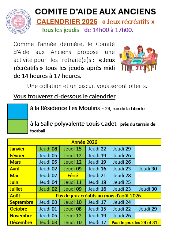 Tous les jeudis après-midi : "Jeux récréatifs" organisés par le Comité d'Aide aux Anciens